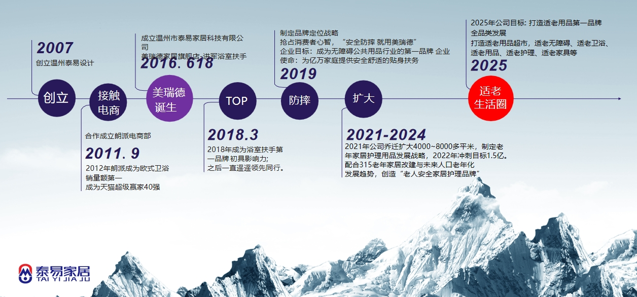 温州市泰易家居科技有限公司(2016年创立)专注于康养及适老化全场景解决方案的研发智造。我们已有100多项自主研发专利,构建涵盖无障碍防摔、厨卫安全、适老护理、健康出行、适老家具等几大系列产品矩阵,打造「无龄感适老生活圈」体系。服务于40岁以上家庭用户、康养机构及适老改造企业。旗下品牌美瑞德始终践行「让生活回归简便的理念,以人性化设计与智能科技重塑适老生活空间,让幸福生活自然而无负担。