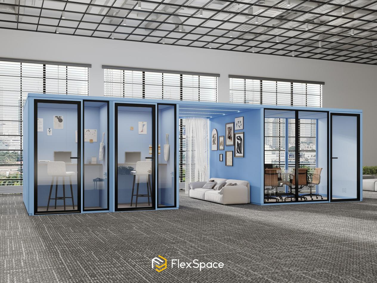 房中房Flexcube系列产品则是可快速部署的模块化办公空间。它打破传统装修的漫长周期,为企业提供即插即用的完整办公解决方案,助力团队轻装上阵、快速扩展。