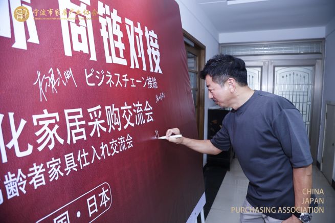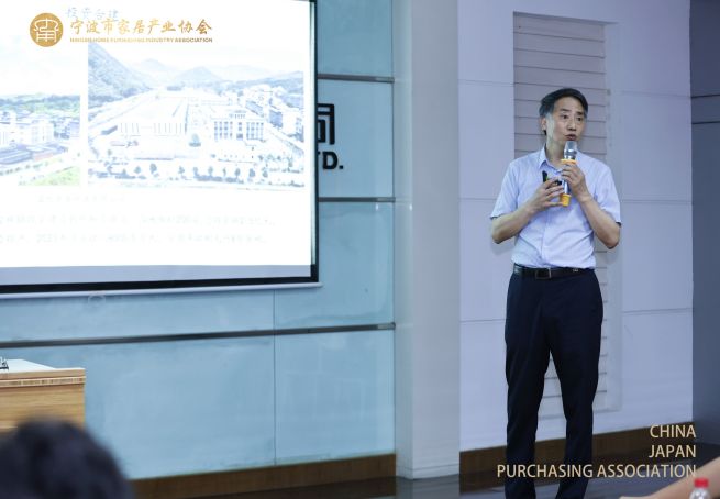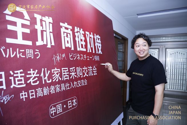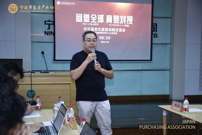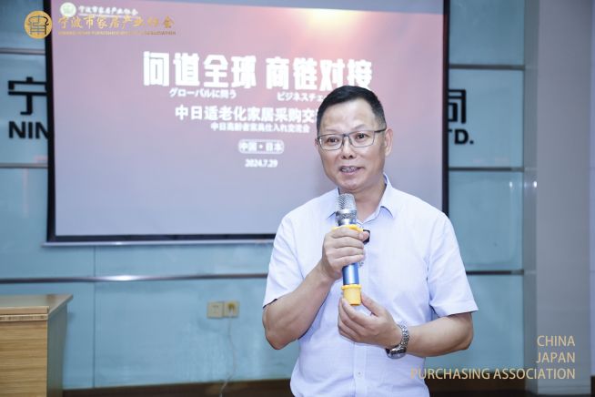 协会执行会长兼秘书长杨君渊致欢迎词,他热情的欢迎了各位远道而来的日本朋友,并简单介绍了协会的基本情况,我会会员企业涵盖了整个大家居产业的各细分领域,目前协会会员400多家,年产值过亿的头部企业约100家,会员年产值超过一千亿元人民币,此项数据得到了日本企业家的惊叹。杨君渊表示我会近两年在重点打造大家居产业生态链,其中一条重要的产业链就是医养家居,去年9月我会组织会员第一次去日本研学,今年又连续组织了两次赴日研学,今天很荣幸邀请到日本企业家来宁波采购交流,他表示非常感谢。他说:中国的养老产业刚刚起步,有很大的市场空间,今天的交流会只是开始,日后将继续加强更多的交流与合作,我们不但要引进日本好的产品和理念,也要将中国好的产品销往日本,我们共同努力,赋能养老产业发展。