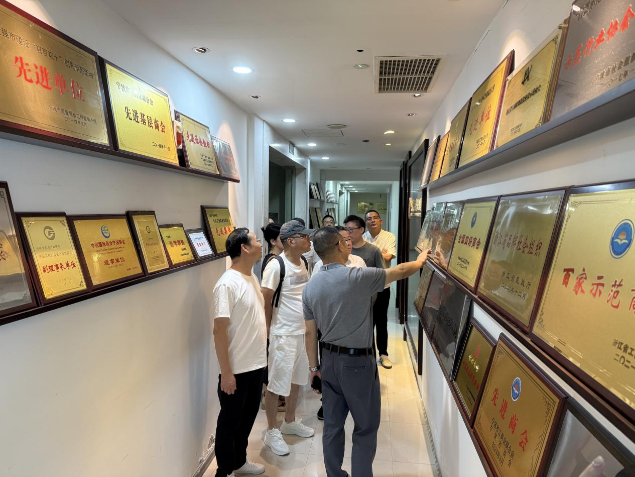 来访团成员参观了我会办公场地和宣传阵地,并在我会会议室进行了深入的交流,杨君渊详细介绍了我会民主办会·深化组织建设;规范管理·加强制度建设;商链对接·服务会员降本增效;商创标准·赋能产业新质发展等方面的工作,重点介绍了我会在“珍珠链”党建品牌打造中的实践经验。
