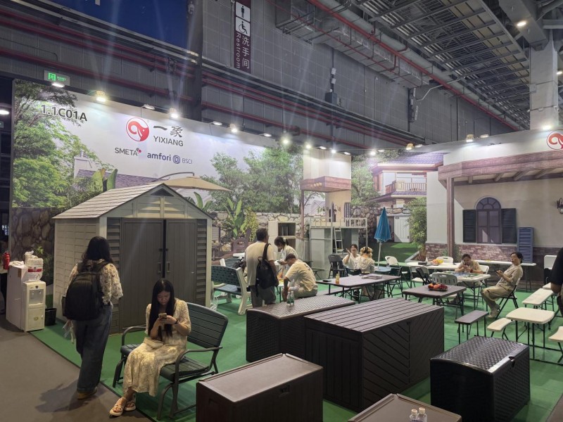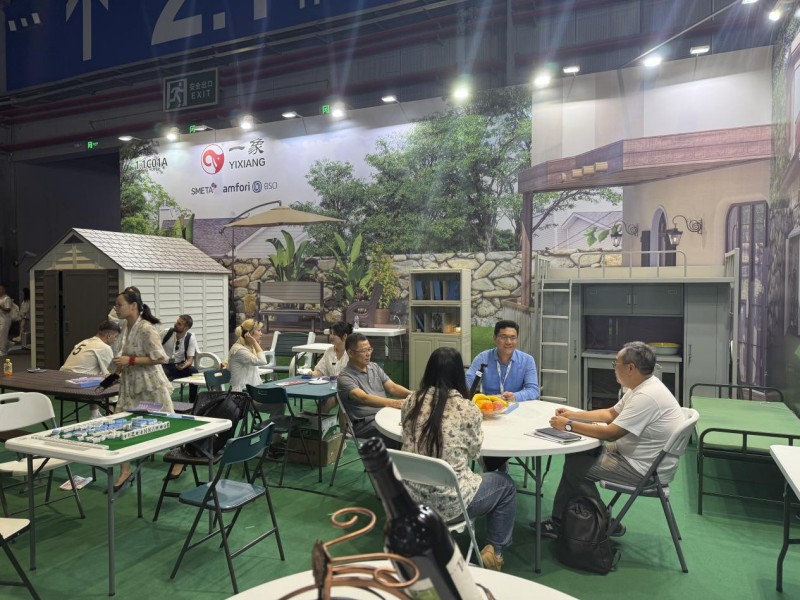 在协会优秀企业宁波一象吹塑家具有限公司1.1C01A展区,总经理蒋晶磊与杨君渊交流了一象在吹塑家具的全新思路,以吹塑庭院户外家具硬核开辟海外市场,展会期间来访者络绎不绝。