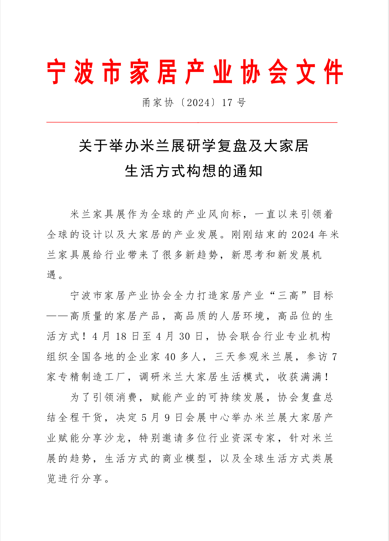 > > 甬家协〔2024〕17号关于举办米兰展研学复盘及大家居生活方式构想的通知