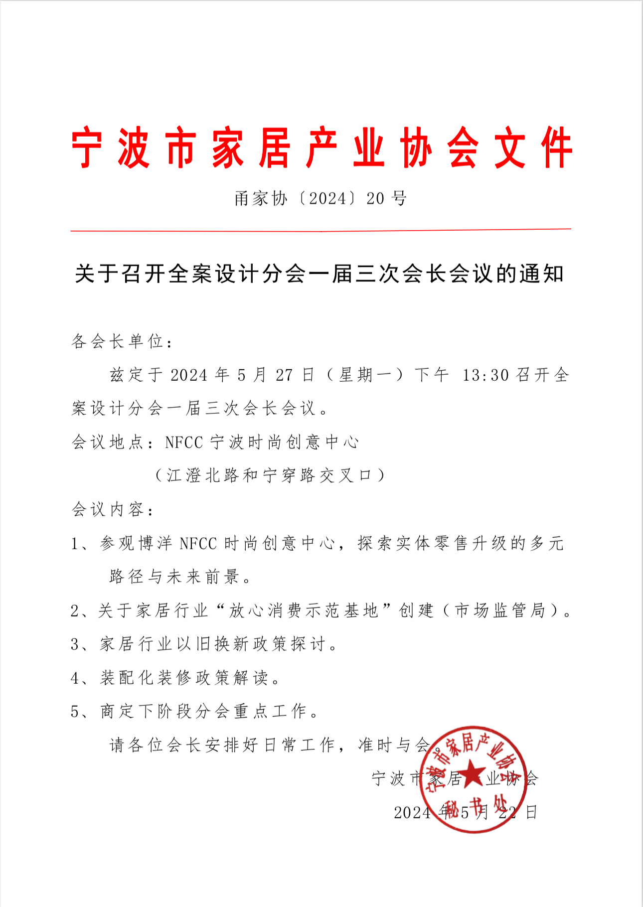 > > 甬家协〔2024〕20号关于召开全案设计分会一届三次会长会议的通知