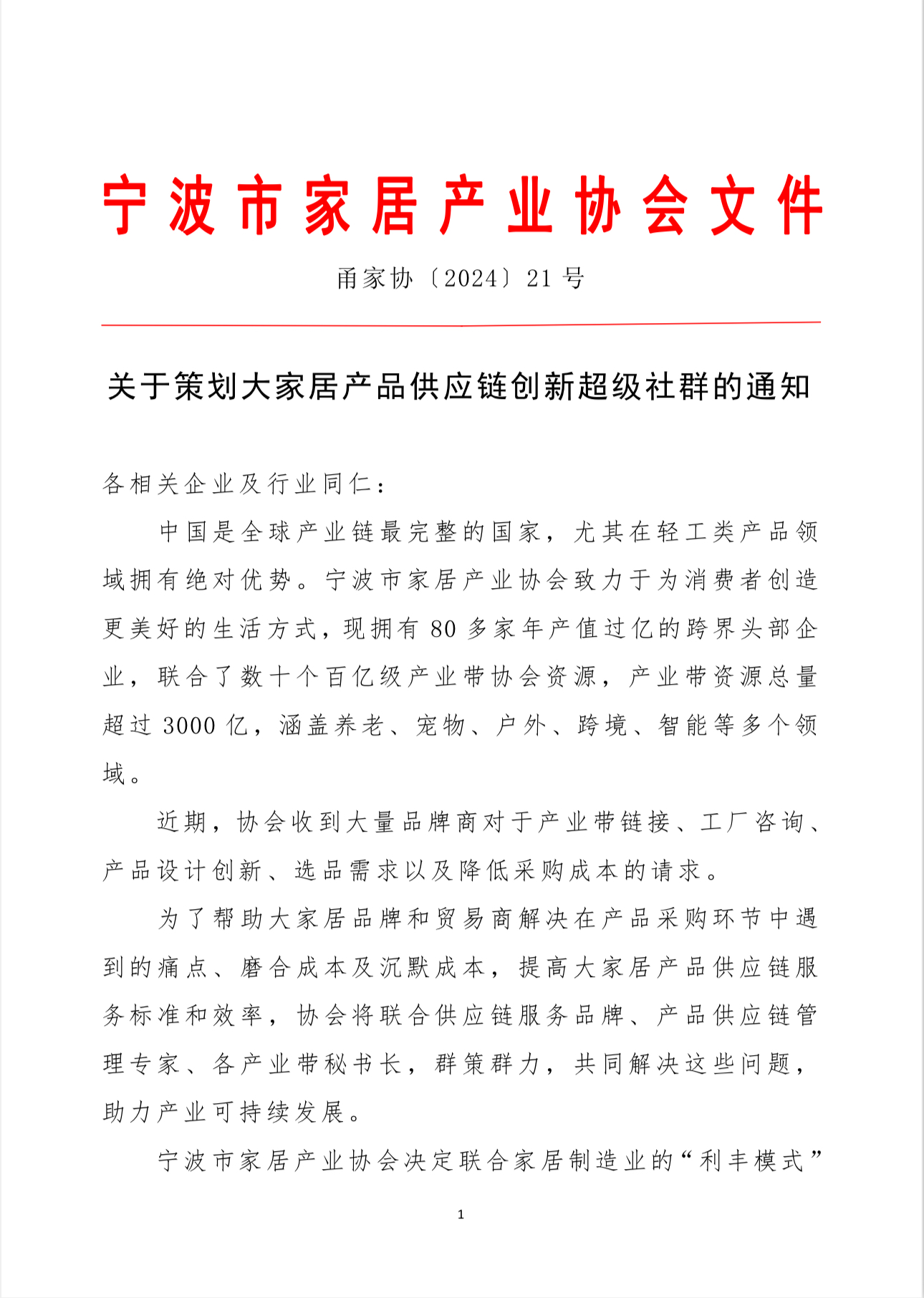> > 甬家协〔2024〕21号关于策划大家居产品供应链创新超级社群的通知