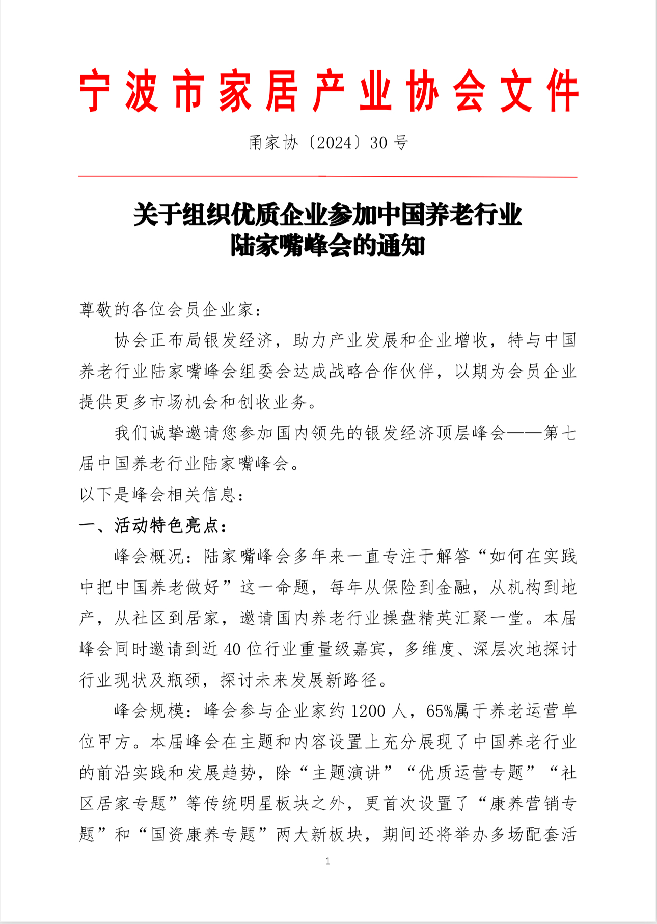 > > 甬家协〔2024〕30号关于组织优质企业参加中国养老行业陆家嘴峰会的通知