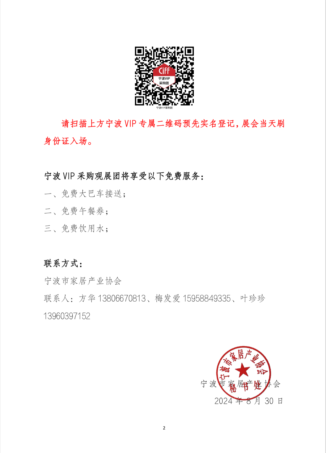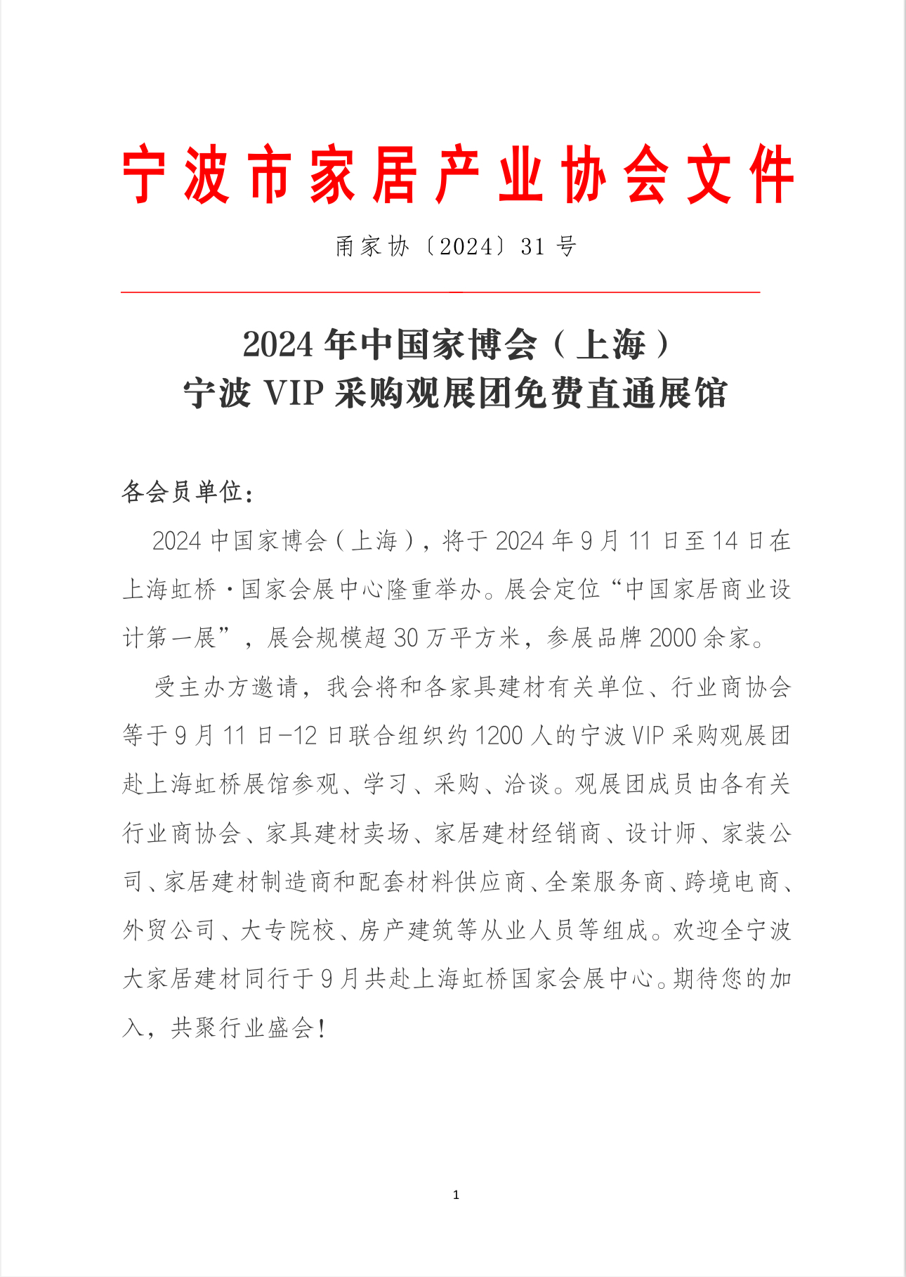 > > 甬家协〔2024〕31号关于组织2024年中国家博会(上海)宁波VIP采购观展团免费直通展馆的通知