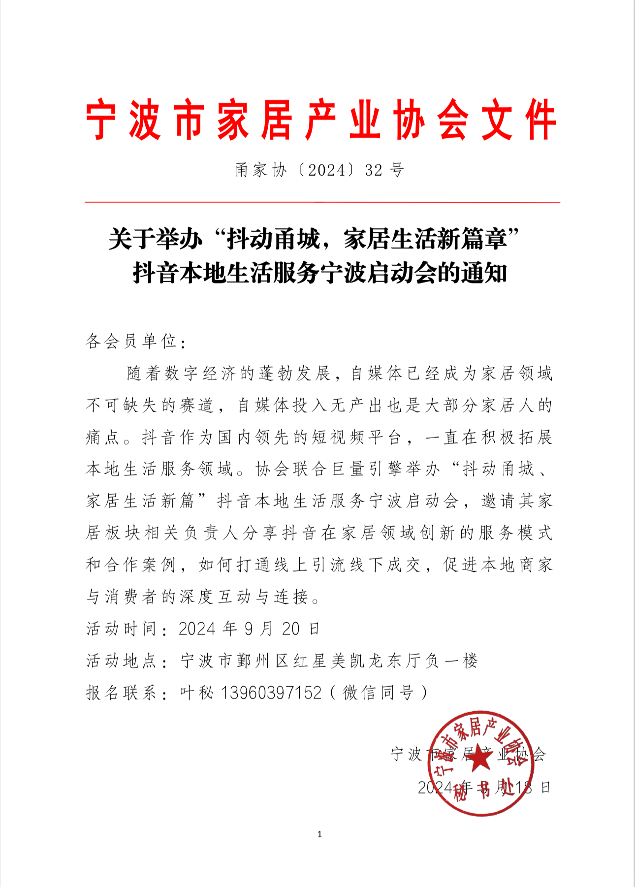> > 甬家协〔2024〕32号关于举办抖音本地生活服务启动会的通知