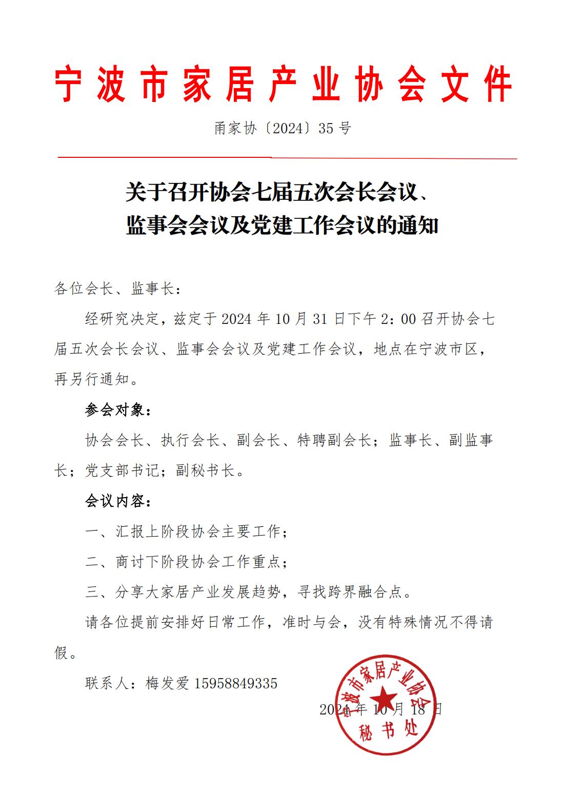 > > 甬家协〔2024〕35号关于召开协会七届五次会长会议、监事会会议及党建工作会议的通知