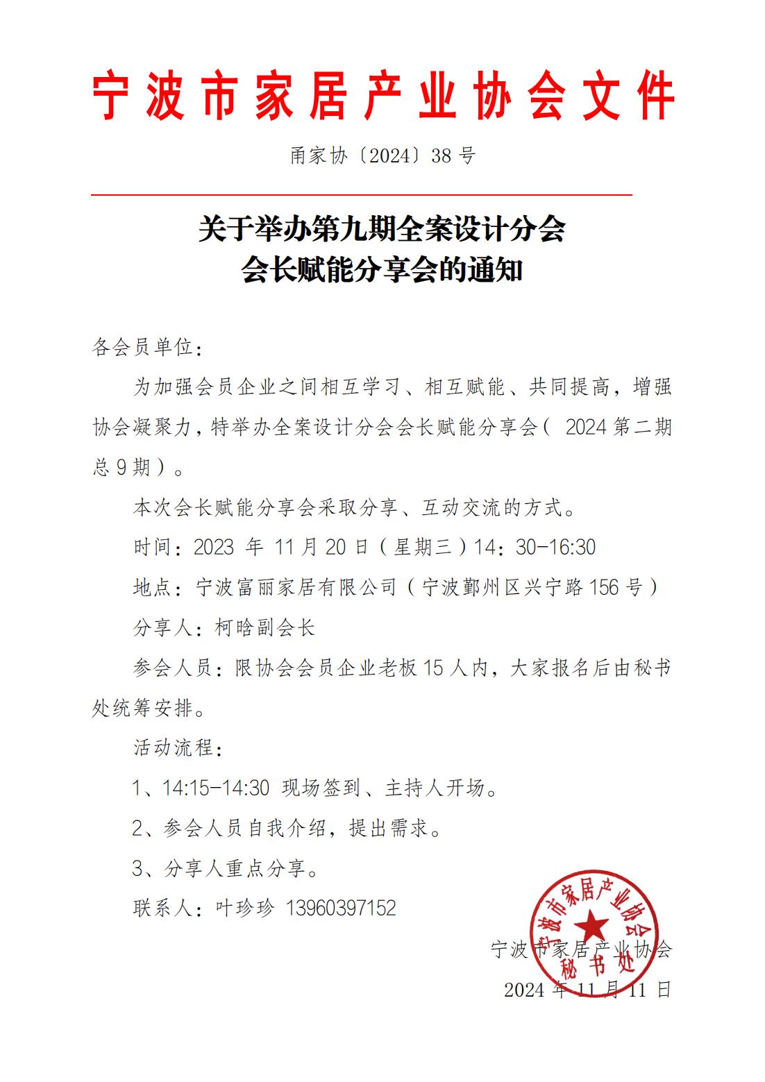 > > 甬家协〔2024〕38号关于举办第九期全案设计分会会长赋能分享会的通知