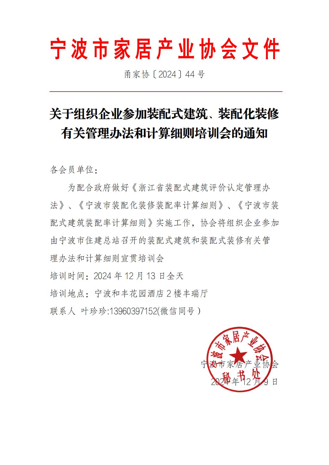 > > 甬家协〔2024〕44号关于组织企业参加装配式建筑、装配化装修有关管理办法和计算细则培训会的通知