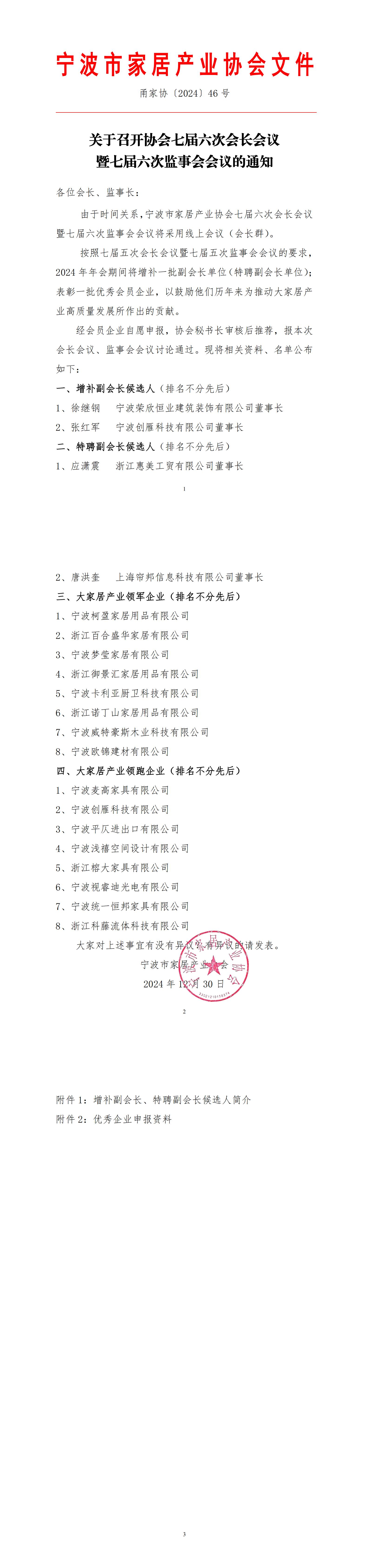 > > 甬家协〔2024〕46号关于召开协会七届六次会长会议暨七届六次监事会会议的通知