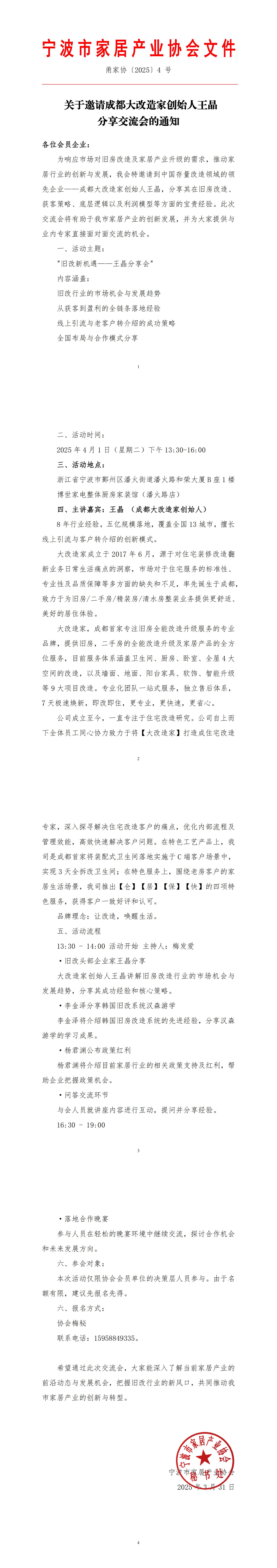 > > 甬家协〔2025〕4号关于邀请成都大改造家创始人王晶分享交流会的通知
