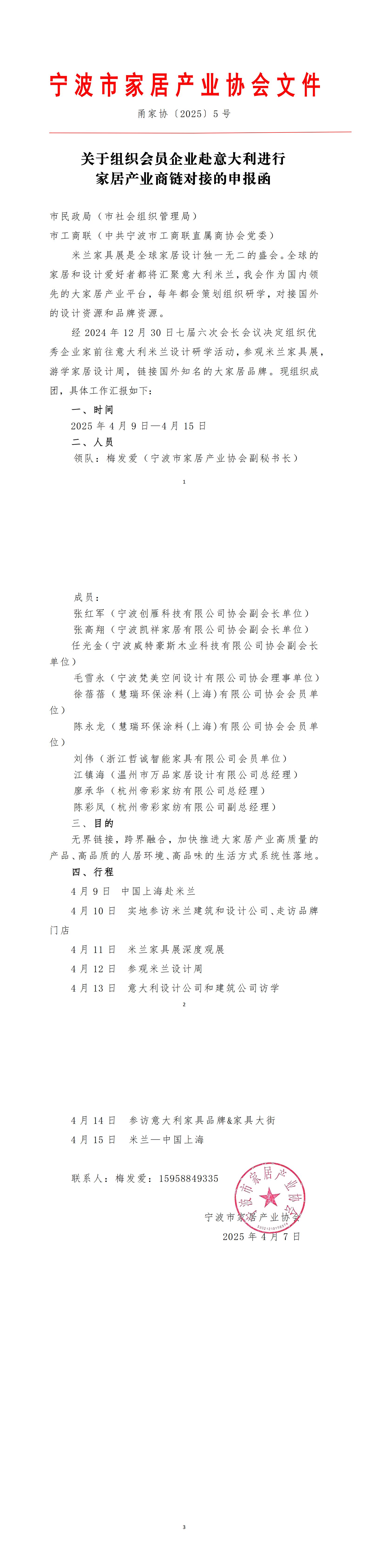 > > 甬家协〔2025〕5号关于组织策划米兰设计研学的申报函