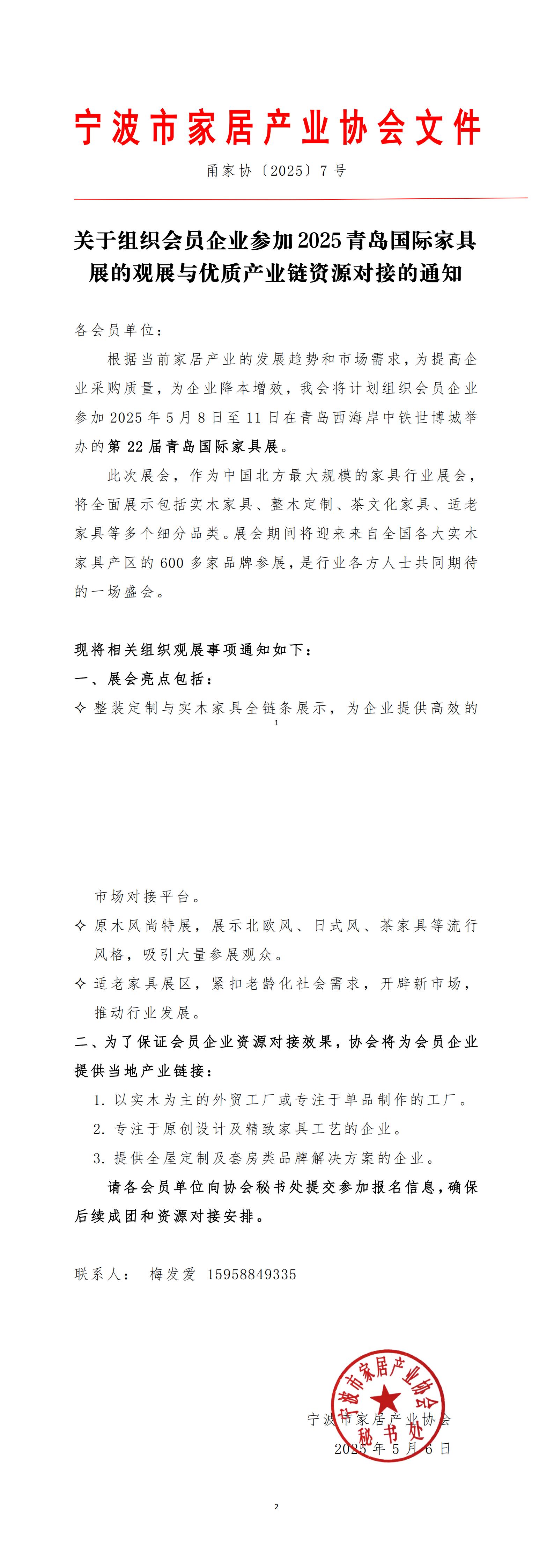 > > 甬家协〔2025〕7号关于组织参加青岛国际家具展的通知