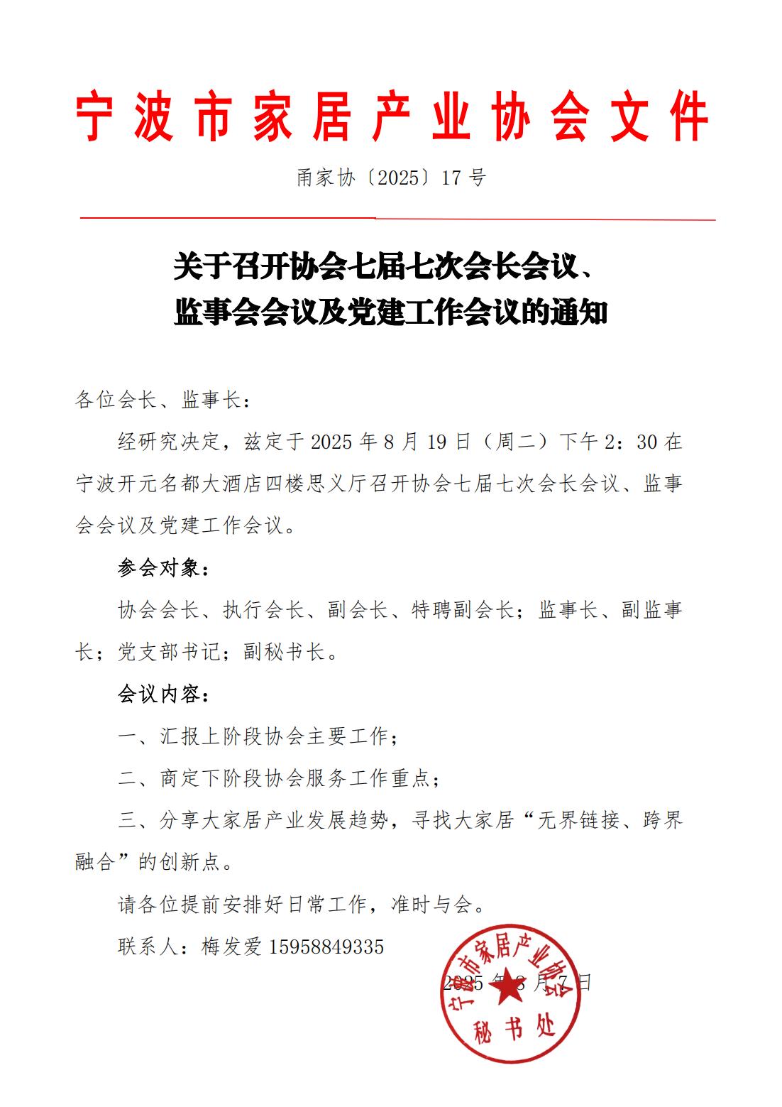 > > 甬家协〔2025〕17号关于召开协会七届七次会长会议、监事会会议及党建工作会议的通知